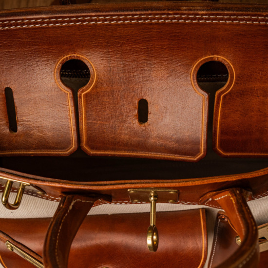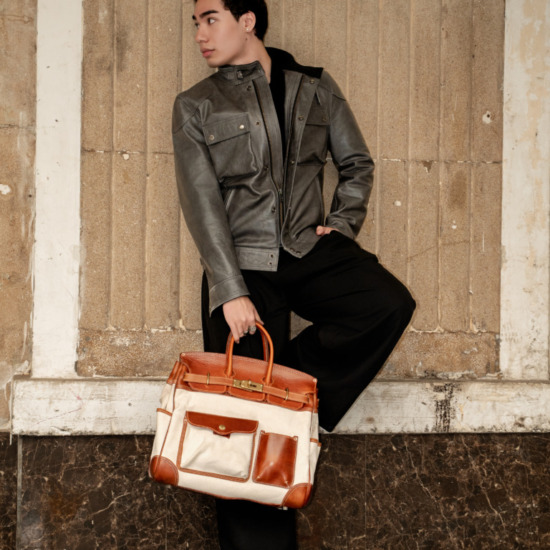 Inspired by classic U.S. military aesthetics, the design blends rugged workwear spirit with a strong handcrafted character. The turmeric-toned brass lock hardware adds a refined fashion statement, elevating the overall look. Its generously sized structure comfortably fits a laptop along with multiple personal essentials.