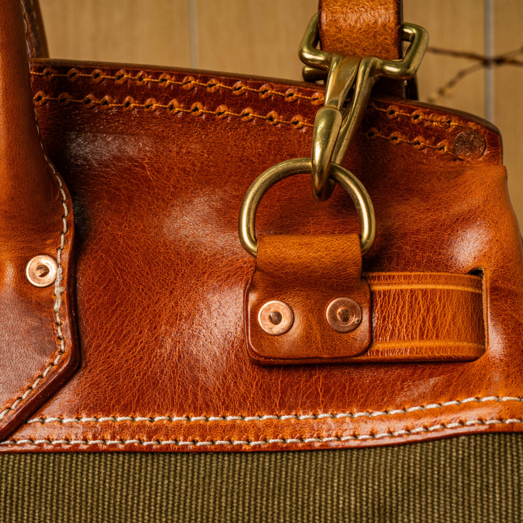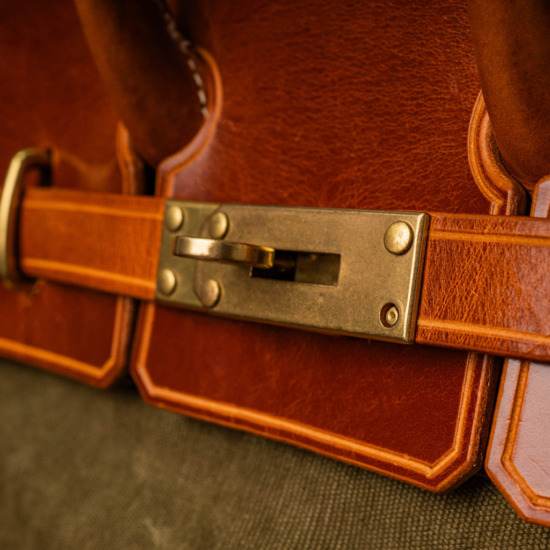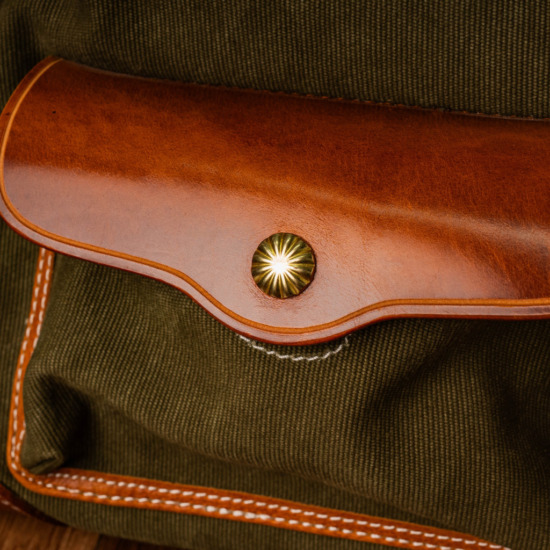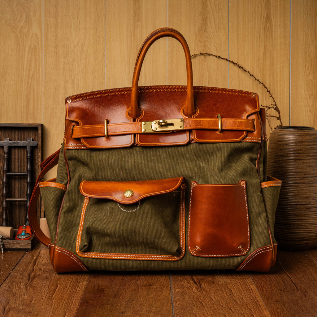 Inspired by classic U.S. military aesthetics, the design blends rugged workwear spirit with a strong handcrafted character. The turmeric-toned brass lock hardware adds a refined fashion statement, elevating the overall look. Its generously sized structure comfortably fits a laptop along with multiple personal essentials.