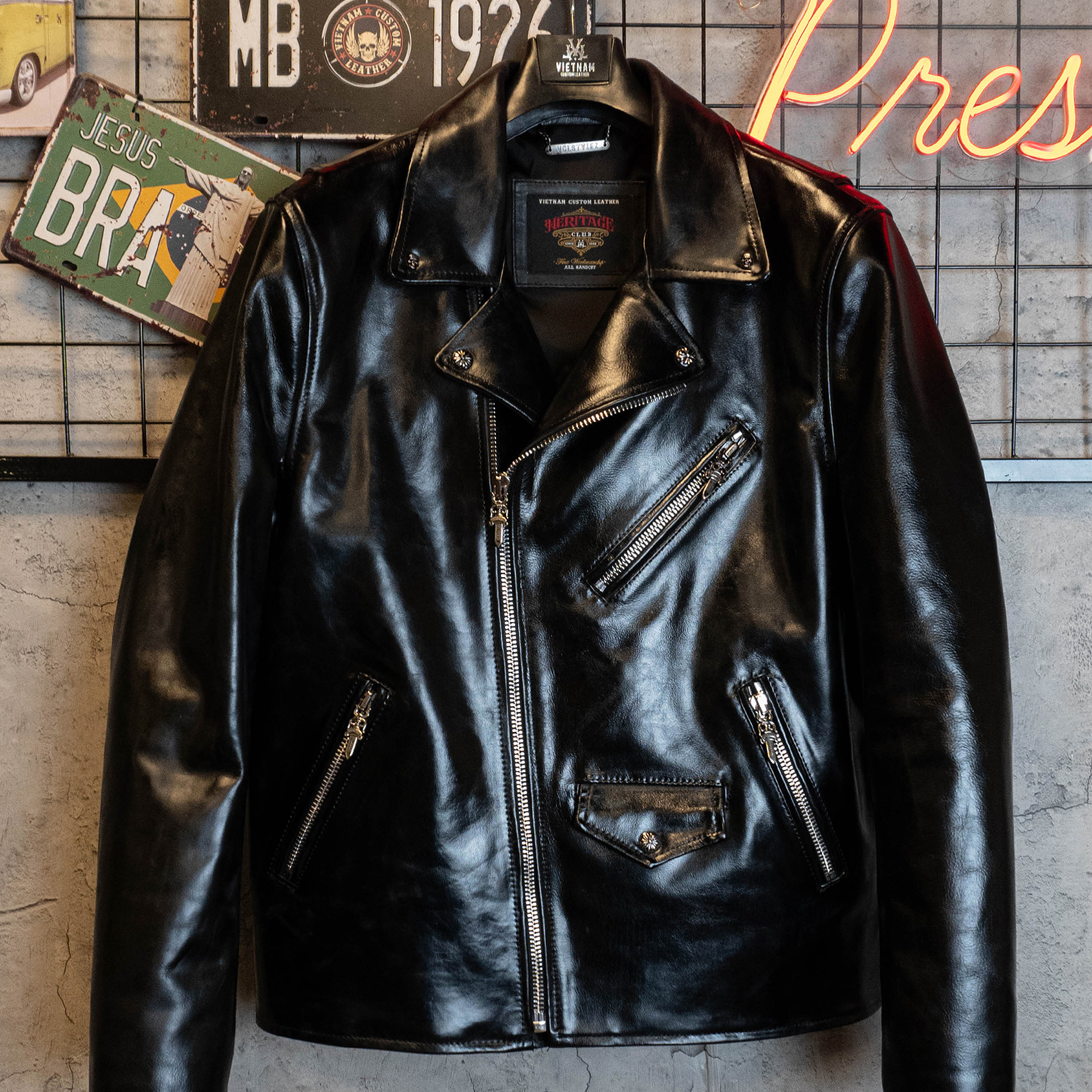 Lấy cảm hứng từ phong cách biker huyền thoại, Skyfall Bikerjacket “CH” Custom là lựa chọn hoàn hảo dành cho những tín đồ yêu thích sự mạnh mẽ, cá tính và đẳng cấp vượt thời gian.